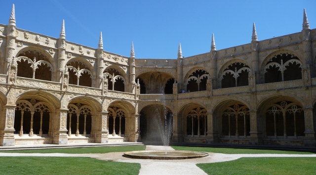 The district of Belém is famed for its ‘pastéis’ – small custard tarts which should be bought from the Antiga Confeitaria de Belém. This cafe trades on its 100 years of serving these secret recipe pastéis and has opened every conceivable azulejo-adorned room it can. The result is rather like a maze of canteens, getting more and more like a motorway services cafeteria as you go further in. We had breakfast there in one of the original outer rooms and it set us up for the day. We needed the energy to see Belém’s other sights – St Jerónimo’s monastery and church (Mosteiro dos Jerónimos) built in the rather frilly Manueline style – after King Manuel I (1495-1521). It’s a rich ornamental Portuguese version of late Gothic architecture we’ve seen many examples of on our wanders, but Jerónimo’s is thought to be the finest. Explorer Vasco da Gama who opened up the sea route to India is entombed here (his remains moved from the church in Fort Cochin in Kerala, round the corner from where I stayed earlier this year). We were disappointed in the extent of what we got to see at Jeronimo’s. For the price of €7 per person our visit seemed quite short compared to our three hours or so at Tomar’s Convent of Christ. Entry charges have formed a significant part of our expenditure in Portugal.