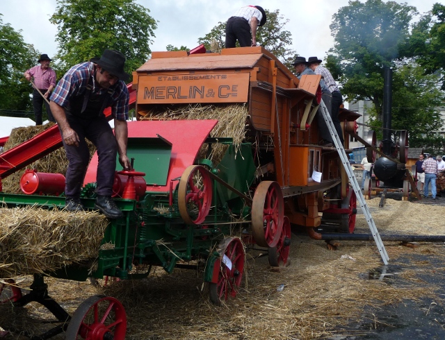 There was lots of activity in the centre of the square show area with steam driven contraptions of all sorts just getting going. Traction engines’ shrill whistles and everything from a 1950s threshing machine and baler to a band saw turning tree trunks into planks. A huge display of tractors, old and new, all with their engines left running. A rope making demonstration, a blacksmith and his trainees playing with giant bellows. And round the edge of the fair, craft and regional food stalls, with lots of tastings which we freely partook of (as ever). Most notable was our lunch snack of Cantal cheese crêpes and tasty micro brewery beer served by the brewer himself.