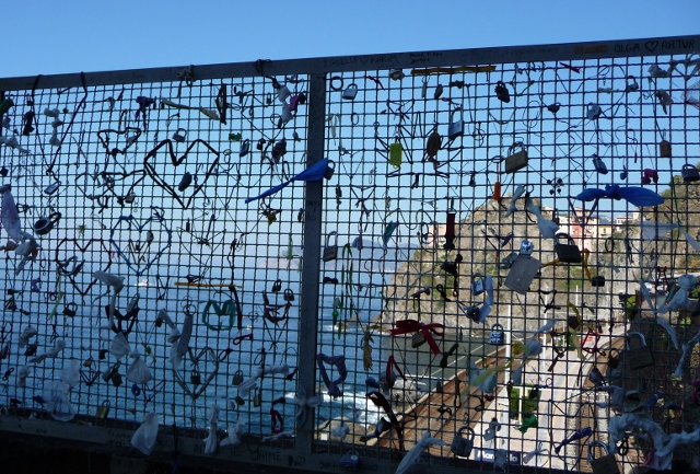 We walked westwards from here to Manarola. This was the most crowded stretch as it is the easiest, the coastal path being largely paved and flat. It is known as the Via dell’Amore, or lovers’ path, and it features many padlocks. We first came across the phenomenon of people putting padlocks on public railings, to symbolise their relationships, on a bridge in Seville a few years ago. Here they’d even erected extra wires to cater for this craze. However, it looked rather tatty in places as those who had forgotten to bring a padlock had tied bits of plastic bag to the wires.