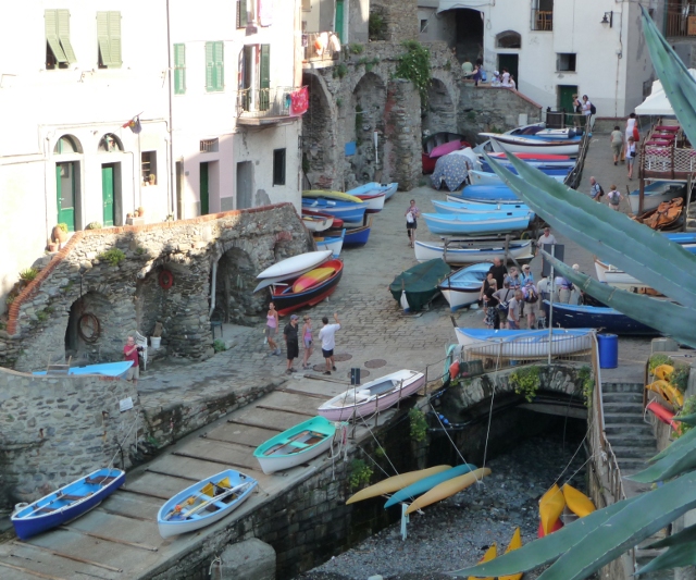 We took the train from Deiva Marina to the furthest of the five, Riomaggiore, a village rising up the steep hillsides from a tiny harbour, with multicoloured houses – most now being gift shops.