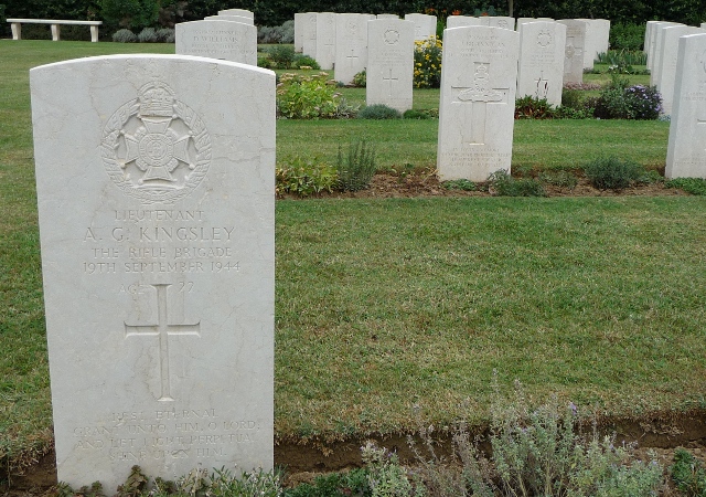 Adrian Garraway Kingsley was my father’s cousin, someone he had looked up to during his youth and spoke of fondly. We visited Adrian’s grave in the Florence War Cemetery for British and Commonwealth forces killed between 1943 and 1945. It was an even more poignant interlude for us when we realised that we were visiting on the eve of the 67th anniversary of his death in September 1944. Adrian Kingsley died helping to liberate Florence from its occupiers, and his is one of more than 1600 graves in this beautifully kept cemetery just outside the city by the river.
