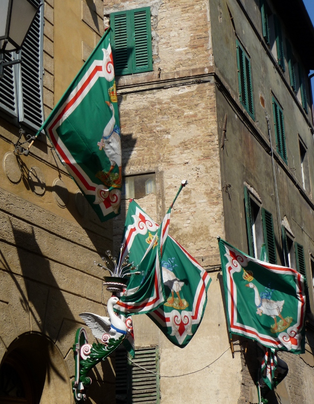 There is plenty to see here. Siena is distinctly drawn into 17 districts or ‘contrades’ – sort of clan areas started in the twelfth century from the different militia groups set up to protect the city. As you wander round you will see plaques on walls, flags or other signs of that area’s contrade, all named after animals or natural features such as porcupine, giraffe, goose, shell, caterpillar, forest etc. Every year the contrades field horses in the Palio, manic bareback horse races round the magnificent central piazza – the Campo – in July and August and Siena’s annual high point. We missed these of course, but the place was still bustling with tourists of every conceivable nationality.