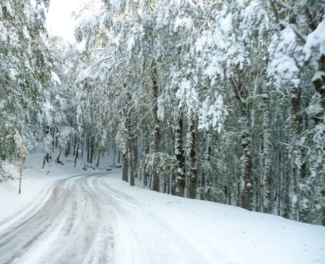 In the morning, we rapidly decided that any plans for walking or cycling that day were not going to happen. The precipitation that greeted us as we sprinted towards the facilities was not entirely liquid. The day didn’t improve, either – and by lunchtime, we were staring out of sleet-lashed van windows wondering exactly what we’d done wrong. The afternoon and evening were spent – for about the first time since we left the UK in May – watching some of the TV and films that we’d downloaded and brought with us on the laptop. The morning dawned more brightly, revealing a light dusting of snow on the grass, with the mountains looking picturesque. The lower altitudes nearer the coast, further south, couldn’t fail to be anything but better than this – but first we had to leave the area. After persuading the van to start – heavy use of heater, stereo and lights had taken their toll on the main battery – the road wound upwards into the mountains, the dusting on the verge turning deeper. Then the road started to whiten slightly. By the time we got to the pass, we were following wheeltracks more in hope than certainty.