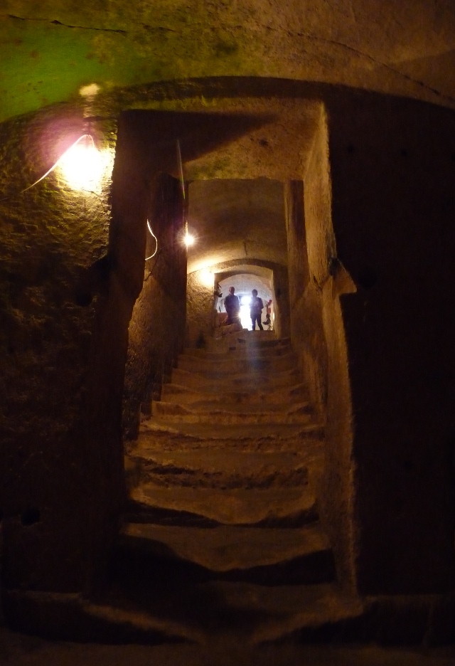 It’s an intriguing place to explore – passages up and down steep inclines, and views across town from all angles. We visited a reconstructed interior of a sasso dwelling giving a snapshot of life as it was, on three levels going deeper into the rock, the family would have lived here together with their livestock.