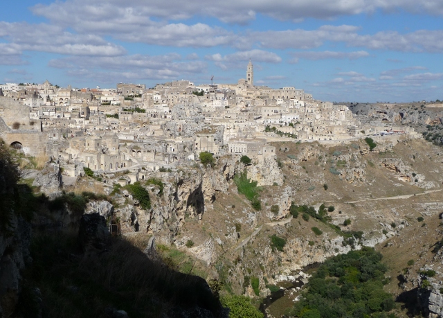 Next morning, after waving Stacey, Frank and Quinn off, we got the free shuttle bus to the centre of Matera with Brian and Sheena. Matera sits above and into a deep gorge and has a unique heritage in its Sassi areas – dwellings hewn out of the hillside in layers. These areas of the town were populated from ancient times up until the 1950s and 60s, when they were considered slums and the people were forcibly rehoused in new accommodation on the edge of town using post-War Marshall Plan money. Since then the Sassi have been cleaned up and declared a World Heritage site. They have been repopulated to some extent and many are still in the throes of being done up.