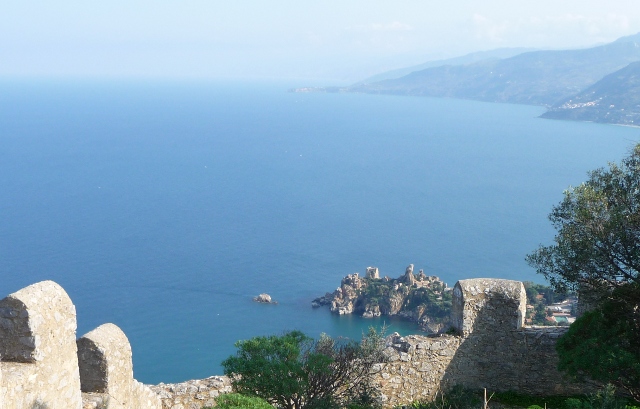 The nearest town, horizontally, to the campsite was Pollina – only a couple of km inland. However, that masked the fact that the town is over 750m above sea level, and the road winds steeply for 11km to get there. Once at the top, though, the town was gorgeous – semi-circular open-air theatre seating with breathtaking vistas over the inland mountains, and the ruins of a castle dominating the coast. A randomly meandering old boy took us under his wing, and gave us a totally unintelligible guided tour of the centre of the town and the views.