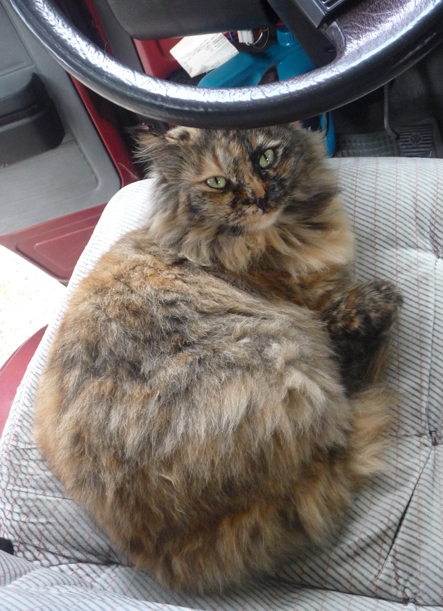 There’s Harriet, a large and very furry tortoiseshell. Sometimes also known as Furriet, she is friendly as long as it’s on her terms. She likes following you around, and likes companionship, but is not a lap cat. She is quick to lash out if you try to overstep her mark. Usually when we try to evict her from the van. She also lashes out at other cats if they come in physical contact. She enjoys her luxuriant fur being brushed. Has been known to try and help you brush your teeth, following you to the ablution block and stretching up to put her paws on the sink … She waddles when she walks and is generally very endearing.