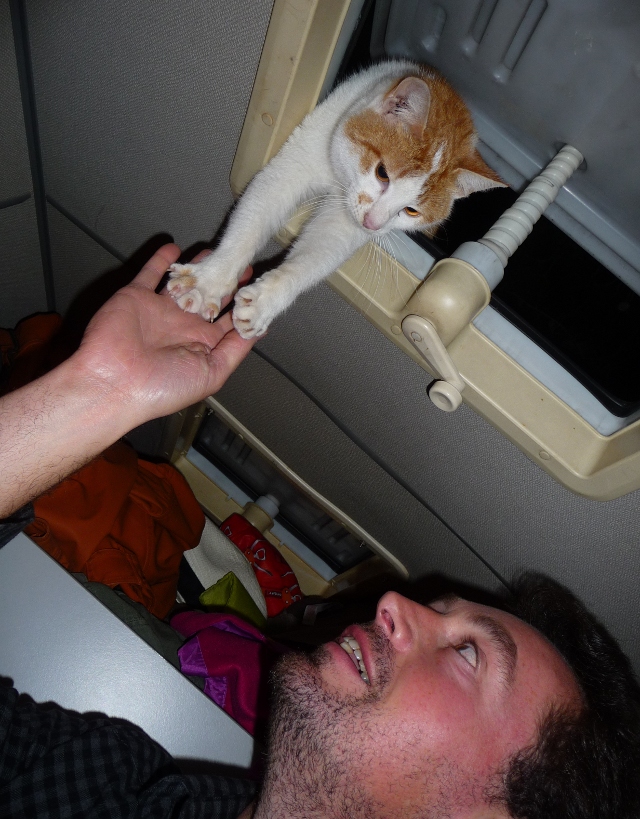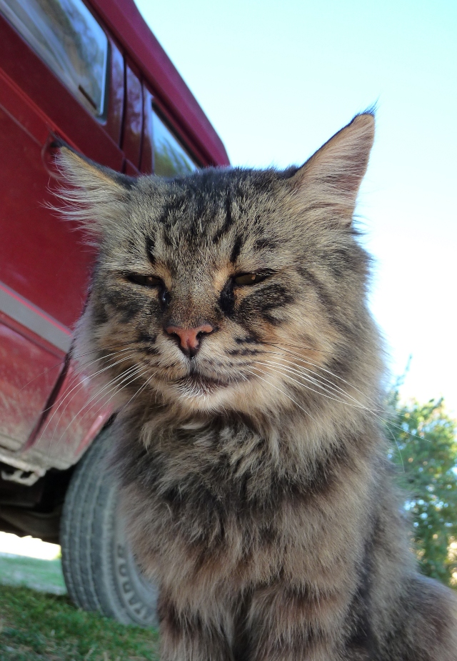 She’s so very furry and round we dubbed her Hairy Harriet the Wombat Cat at first. She often acts like a teenager and huffs off ‘bovvered, me?’ or should that be ‘bovvato mi?’. Last night we couldn’t extricate her from the front of the van and looked set to have her in the van all night. Luckily after we had been dozing for half an hour, we heard movement and managed to entice her out.