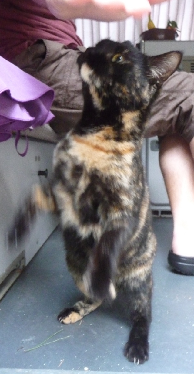 Polly. A petite dark shorthaired tortoiseshell with a delightful chirruppy miaou. She is the affectionate ballerina of the bunch – and will head butt your hand and stand on her hind legs in a most delightful way. She likes to come in the van but doesn’t settle and doesn’t know about soft paws, so is a pain quite quickly – literally. She too is irresistible, hyperactive, but irresistible. Never stays still so not so many good photos of her.