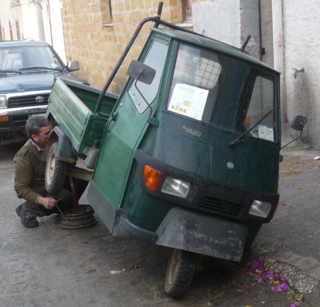 Even better, there was the entertainment of learning a bit about Ape-fixing. It seems you don’t need a jack, merely an old car wheel with a length of steel pole welded to it as a prop. Just grab one rear corner, heave, tip, and stuff the prop underneath.