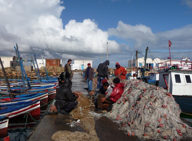 After struggling with wet washing, the day was spent lazily. Our second day was also very mixed weather wise, Ismail invited us to take coffee with him in the nearest larger town, Jebiniana. In general, a lot of the cafés one sees around Tunisia tend to be quite barely decorated, smoky and crowded with men talking over strong coffee or sweet mint tea. Not attractive places for women to enter or linger. This one was no exception, but being with a Tunisian I was able to get over the hurdle of sitting and talking with Ismail and his friends (and Adrian too of course), although I did feel a bit conspicuous.