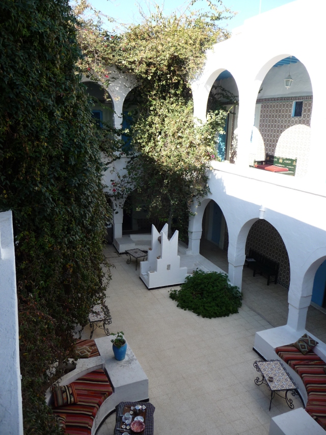 However, for our last night, we moved from the campsite into Houmet Souk, and treated ourselves to a night in a hotel in an old “fondouk” – originally, offering shelter and food to traders, pilgrims and other travellers, around a central courtyard where their camels and goods would have rested the night. Brightly coloured patterned tiles were everywhere, even around the bed structure in our room, whilst large climbing plants in the courtyard were thick with loudly chattering roosting birds. Breakfast, of course, was served in the courtyard – a bit chilly before the sun climbed high enough, but so pleasant as to be irresistible.