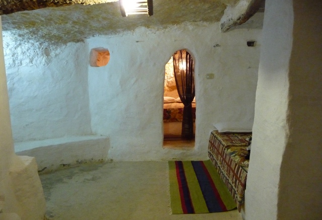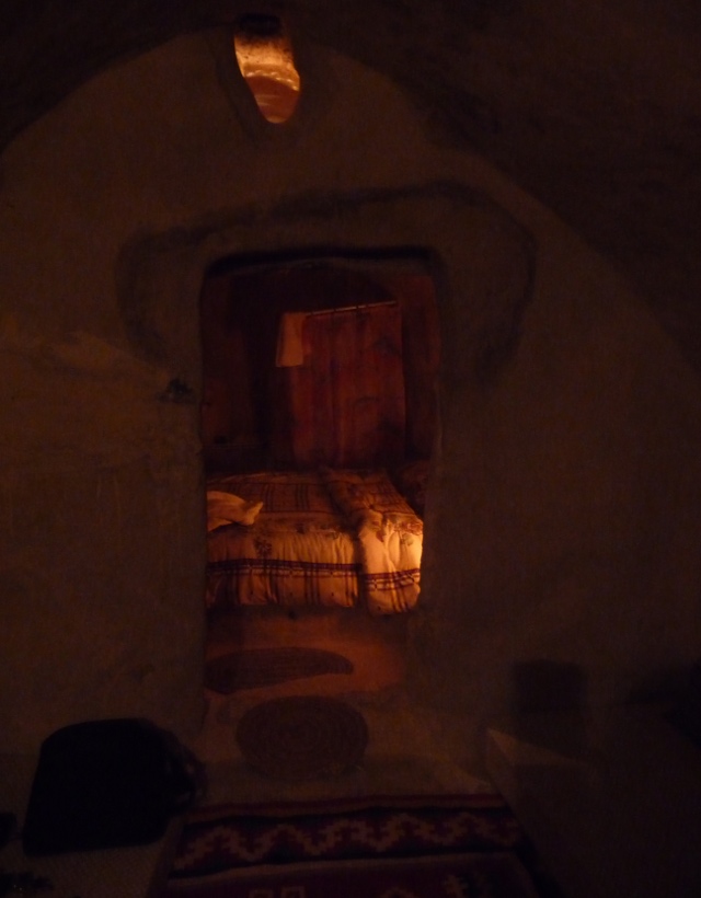 One of those opens into our room – which would originally have been one family’s home. Again, treating the space very sympathetically, a living area passes through an archway into the sleeping area, with walls gently curving through strata of rock into the ceiling.