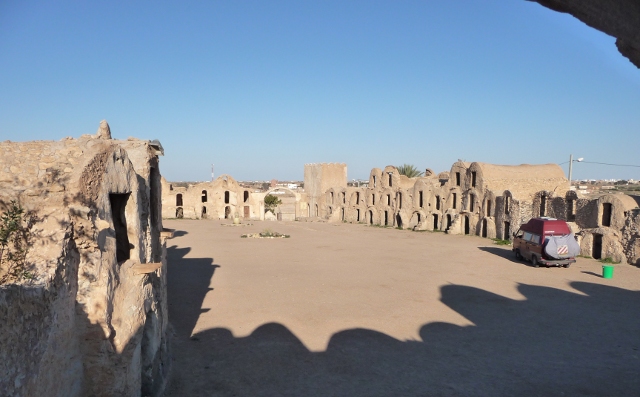 Our first night’s stop after Djerba was in a small village, Metameur, near Medenine. Our guidebook said that there was a Ksar there with Ghorfas converted into hotel rooms, but you could also camp in the courtyard itself. It turned out that the hotel had long since closed, but camping was no problem.