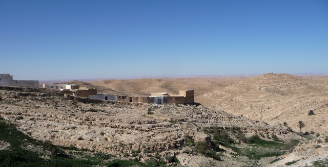 The road from Metameur wound up and down through spectacular scenery and views into the mountains, taking us through Toujane – semi-abandoned ancient dwellings tumbling down across both sides of a gorge, with the ruins of old forts high above.