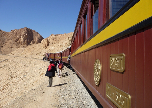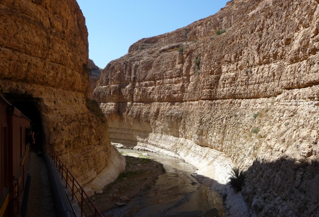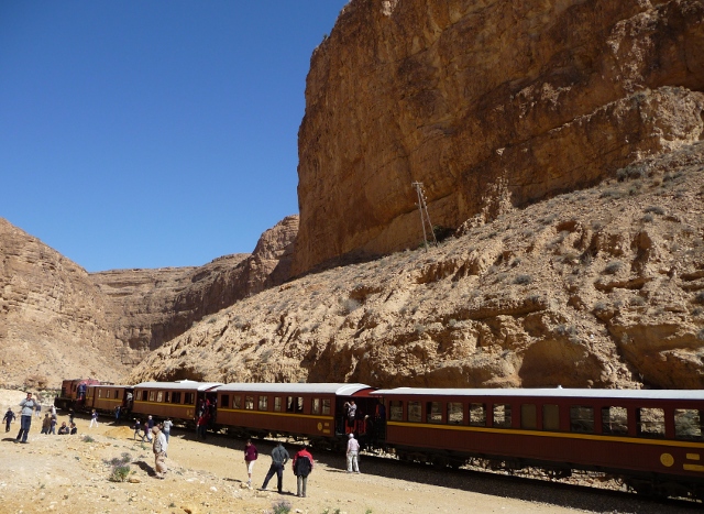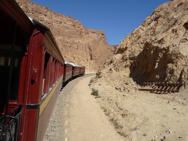 The “Red Lizard” was the personal train of the Bey (the King, before 1882 and the French colonisation) and makes a little known but iconic sightseeing journey. Restored 19th century carriages are pulled by a modern diesel locomotive – unfortunately not steam – up into the Seldja Gorges in the mountains east of the mountain oases. It doesn’t run every day so we’d arranged a few days around making the trip. If you get to the station at Metlaoui early you get the best seats. We arrived very early, way ahead of the hotel day trippers, and were rewarded with the plush leather sofa in the Bey’s own carriage.