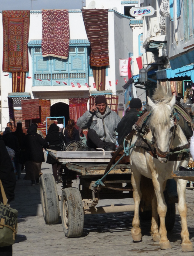 Thin plastic flyaway bags, whispering on the winds and catching on trees, a blighting blossom. The elegant young women of Tunis, their grandmothers, perhaps, some of the elderly women we saw bent double under 20 litre water carriers out in the country. Washing their clothes in the local stream.