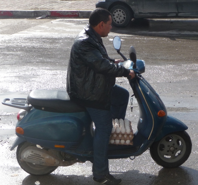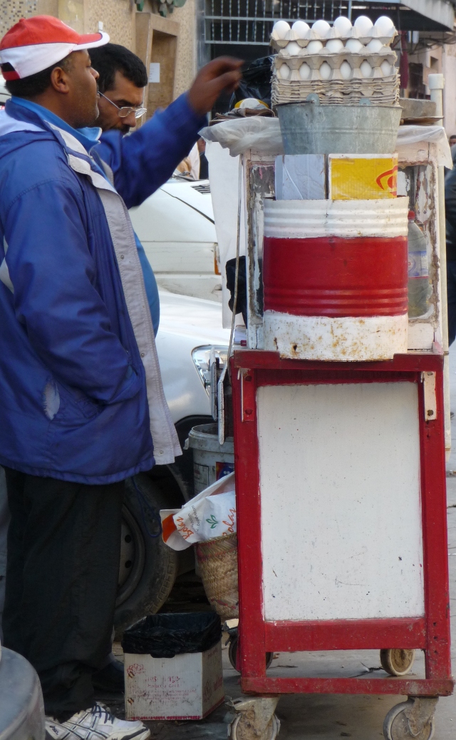 Tunisians buy huge trays of 30 eggs at a time, and they nearly always manage to slip eggs into a meal at some point. You can buy single eggs at any hole-in-the-wall grocery too. Brik a l’oeuf is one of the national dishes. It usually consists of a thin pastry case deep fried with an egg inside. When you break open the crispy wrapping, the yolk oozes out. Tuna, sometimes mashed potato, herbs and other ingredients are often added to the package. It is a delicious and ubiquitous snack and starter in almost every restaurant. Tajine is totally different to a Moroccan tajine, not a meat stew but a baked omelette wedge (eggs again!) with meat and fresh herbs in it, sometimes served with couscous.