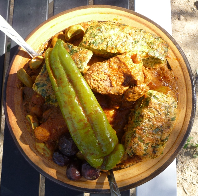 We ate out a lot in Tunisia as it was often as cheap or cheaper to eat out as to buy the ingredients and cook them ourselves. Restaurants are usually very good value and we enjoyed better restaurants without breaking the bank as well as local eateries where dinner for two can cost as little as five pounds. They all have very similar menus though and we braved the Arabic only ones too. Frequently the thing on the menu that’s different and takes your fancy is the one thing they don’t have. Main courses are usually couscous, or chicken and other grilled meats or fish, and chips. Often you’ll see Tunisian diners tucking into something different. Probably a more basic (and cheaper) local dish that they don’t think foreigners will touch, for example, lablabi. This is made of torn up bread soaked in a chick pea broth to which the usual ingredients are added to taste – an egg being served raw on top for you to scramble into the mix yourself – actually much more delicious than it sounds.