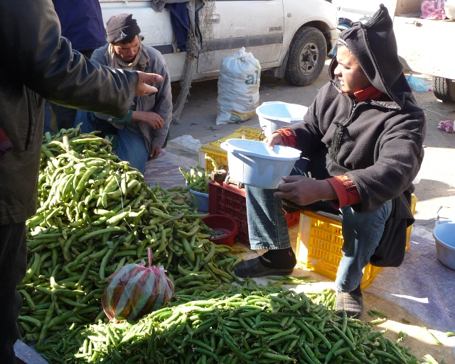 Meat, in particular is no cheaper there than in much of Western Europe, so is disproportionately expensive compared with other goods and with what local salaries are. Butchers specialise in a particular type of meat and there is little refinement in the cuts – it’s just mutton or beef, usually on the bone. The bulls’ or sheeps’ heads are often hung outside the shops. You can’t fault its freshness though, in many parts of the country it’s queueing outside! Although we grew more used to this, it’s still disconcerting to see the live sheep standing underneath the hanging carcass and skins of its cohorts. We felt particularly squeamish after seeing the camel butcher in Douz with a camel’s head hanging outside and its legs neatly arranged, so soon after our camel ride. It wasn’t always possible to find a butcher with a mincer either, and the lamb merguez sausages we became fond of weren’t always available.