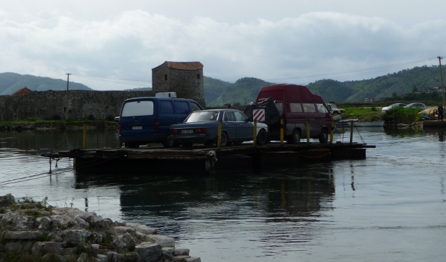After our farewell pizza, we passed through the Italian customs, we were pointed towards a line of about half a dozen cars in a wire-fenced compound, with the back end of a ferry facing us. As our boarding time approached, and the queue had barely doubled in length, the guy in the car in front got out and wandered back to talk to us. Unfortunately for us, he assumed that anybody on a ferry to Albania must be Albanian, so lauched straight into utter impenetrability. Eventually, we figured that he was muttering about the fact we’d been dumped and forgotten… That was when we twigged that the boat which was sat way off to our left was our boat. One car left the queue. We paused, thought, and decided to go for it, too. Everybody else followed us… Fortunately, we’d got it right, and boarded almost immediately – but since our motley convoy turned out to be virtually all the cars and vans on the boat, I suspect they’d have found us sooner or later.