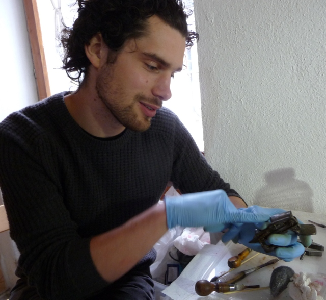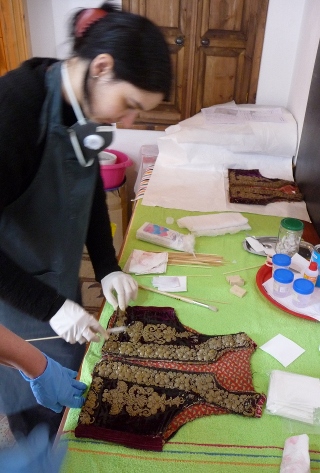 We were recognised by our enthusiastic souvenir shop lady from yesterday, her face hidden behind a mask as she got stuck into cleaning a metal embroidered velvet jacket. Alma and her daughter are some of the local volunteers. Two arms conservators from London were working on beautifully carved guns, making them safe for display is one of their responsibilities.