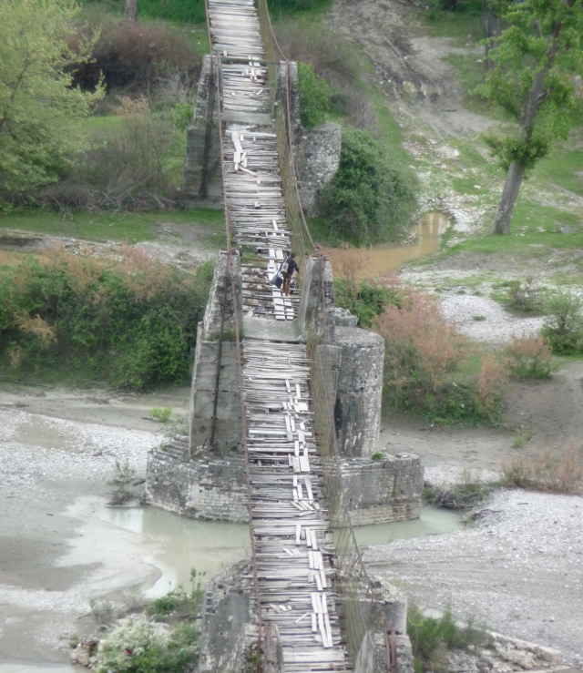 On our way out of town we stopped to peer over the side of the valley to see Ali Pasha’s bridge below spanning the Vjosa river, and still in use … sort of.