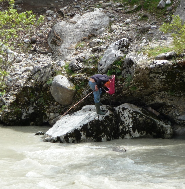 We enjoyed every minute of it though and the sun even graced us with its presence now and then. Dramatic mountains, lush meadows, rushing river torrents and waterfalls crashing down sheer mountainsides, more rickety bridges, eagles swooping in front of the van as they plunged off the side deep into the valley below, ponies and donkeys with their wooden-framed saddles trotting along, cheery waves from their riders. Parking up to take a picture and being greeted by a young boy fishing off a rock on the opposite side of the river. The countryside grew ever more remote and stunning views met very bend.