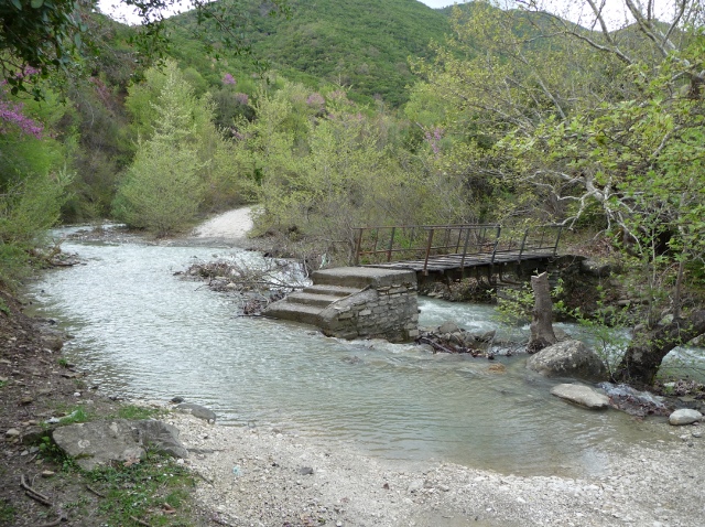 There was a turning off towards some thermal baths a few kilometres away and we decided to have a look. This minor road was very new and perfectly smooth, it lead gently along a valley with abundant pink blossom and forested hills until it ran out into roadworks and a couple of pools of what could be called bubbling water, but we weren’t quite sure. Nothing fully developed then, in spite of the brown sign and new road.