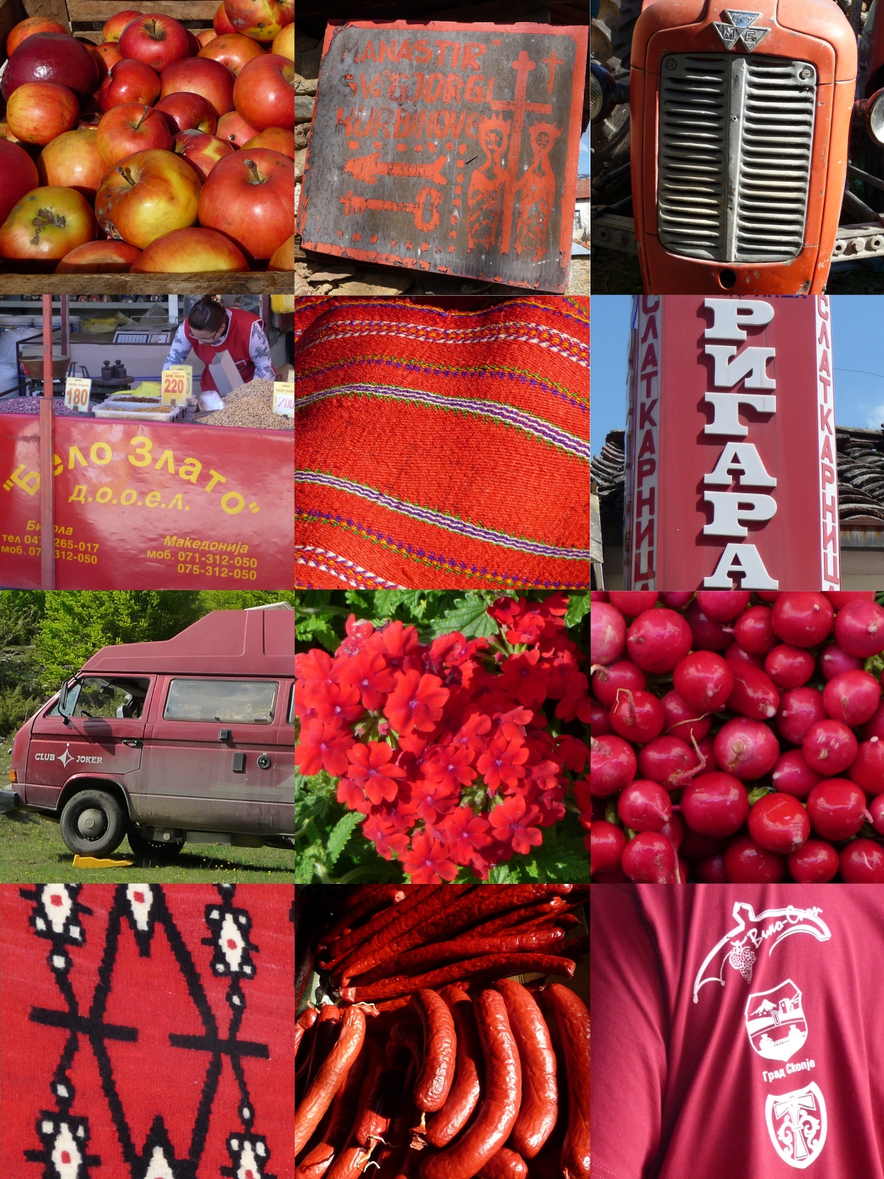 When Lynne suggested we start our Colourboration with looking at the colour red, I left the internet café after reading her email and all I could see was the ubiquitous red branding of the too familiar worldwide soft drink everywhere I looked. We were in Macedonia at the time. This was the day that saw us skid in snow on a mountain top and ended with the perfect camping place at Kurbinovo. I fell in love with the village and was suddenly more inspired when I kept spotting reddish things everywhere.