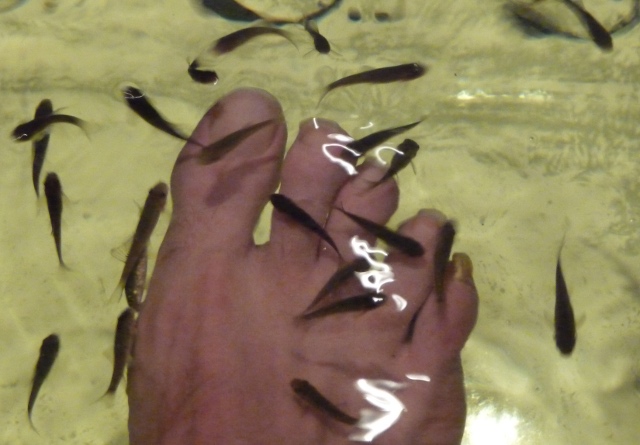 The old town spills out of the palace walls on one side, giving a different feel. It’s this side of the city which provides a home for the fish market – one of the best we’ve seen for quite a while – actually, about the only one we’ve seen whilst it’s been open, if truth be told… Down the waterfront, a broad pedestrianised boulevard (resplendent in the name of Obala Hrvatskog Naradnog Preporoda – Quay of the Croatian National Revival – but known to everybody as the Riva) is lined with cafes looking out over the harbour. It’s a really easy city to like, despite the ubiquitous crowds of cruise-liner tour groups being herded through. You don’t need to go far out of your way to leave them all behind, and find small shops selling all sorts of everything. The old town still lives and breathes as it wants to, living from the hordes of tourists, but not being dictated to by them. We found a bar, hidden in the city walls, with a great view over the top of the Riva and onto the harbour. We seemed to be the only tourists there, as we sat with a cold beer and a plate of simply superb local ham and cheese. Just around the corner from the fish market, we passed a small shop to a chorus of giggles and gasps from inside – intriguing… It turned out to be a fish spa, where the escapees from the fish market turn the tables on humans. You sit, with your feet in a pool of water, as your toes are nibbled at and any dead skin etc is cleansed from them. The sensation was not unlike a mild electric shock at first, as a throng of little black fish crowded round and did their job, fangs bared. Did it make any tangible difference? Difficult to say, but it felt so – and the pleasant tingling lasted for hours afterwards.