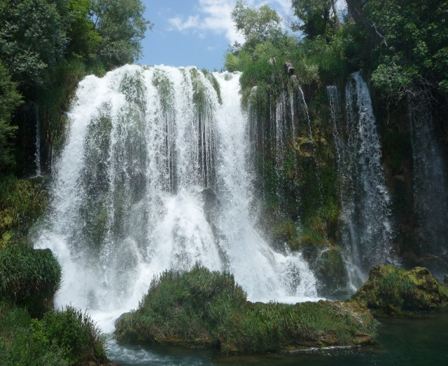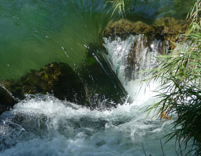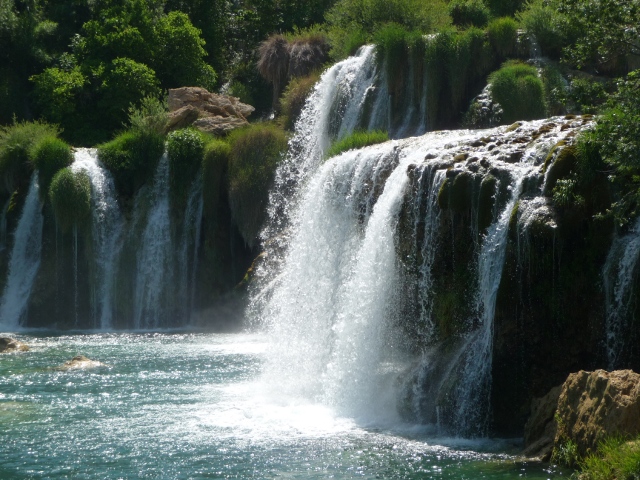 The main falls were cordoned off, probably wise as some young guys were diving from the top … you could go to one side though to find your own exhilarating waterfalls massage experience. Clambouring over rocks, we sat beneath torrents leaving us breathless but joyous. Swimming in caves just a few days before off Vis and Biševo, now we were swimming, climbing and jumping in waterfalls. We managed to drag ourselves away eventually and it was uphill to the bus stop again, to take us up to the entrance and our bikes. It was expensive, but worth every penny. If it had been cheaper we would have been back for more swimming here another day.