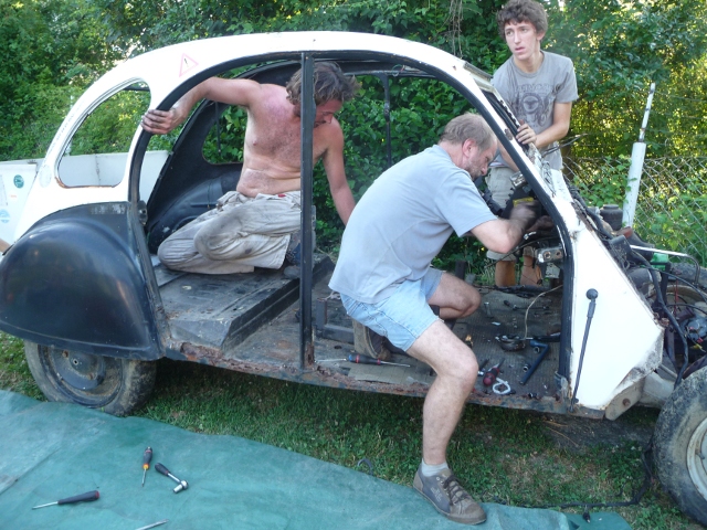 We’d barely arrived at the house, when it was time to turn around and head out – Louis is a 2cv mate, and we had an appointment at a local 2cv’ers place for a barbeque. Even better – there was a reason for the barbeque… We had a car to dismantle! Sat at the back of Strečko’s house was a forlorn and tatty black and white 2cv, which clearly hadn’t moved for years. Fortunately, there was a handy quadbike to tow the car into the shade, ready for work to begin. A tow-rope was hooked on. The quad was revved. PULL! Ooops. We all ducked as the front bumper flew through the air, still attached to the rope. Eventually, work began. Spanners moved in a blur, sweat poured off, dead car parts were thrown into rubbish heaps.