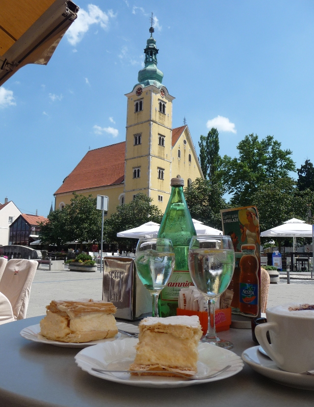 Samobor’s main culinary claim to fame is a creamy pastry – Kremšnite – and to visit the town without trying it is, apparently, unforgivable. Who were we to argue with that kind of tradition? It looks a bit like a big wobbly custardy splodge, sandwiched between puff pastry dusted in sugar, but is very egg-rich and tastes surprisingly light and fresh. Utterly delicious, eaten outside in the town square underneath the onion dome of the church.