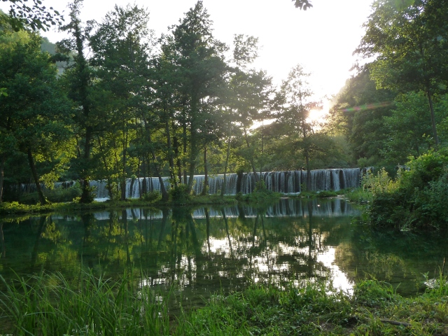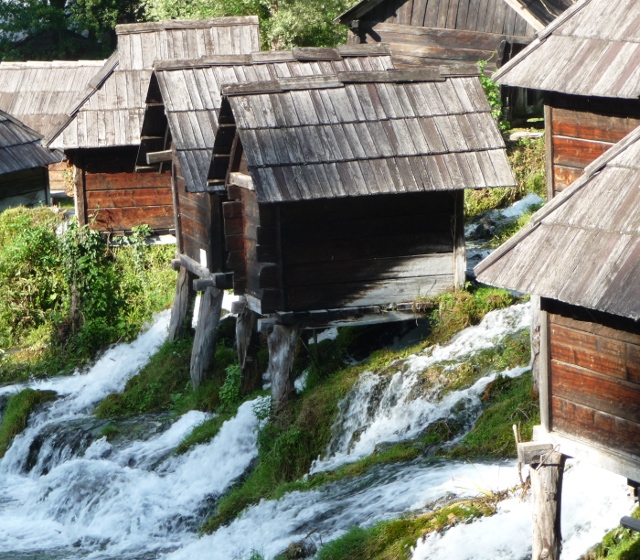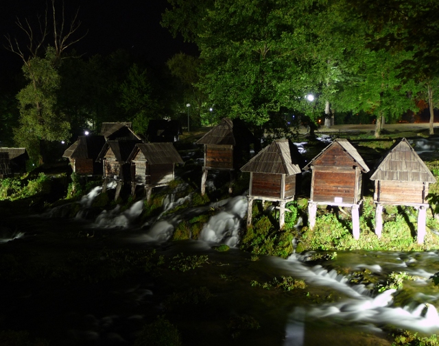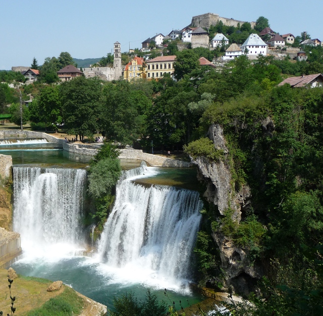 The campsite was at Plivsko Jezero, a lake which flows off into the river Pliva down a narrow valley towards the town, with waterfalls, islands and the by now very familiar forested hills behind. As we came off the main road and followed the signs to the site, we came across the mlinici – mini wooden watermills sitting above a row of waterfalls. The parkland around them was filled with picnicing families and friends.