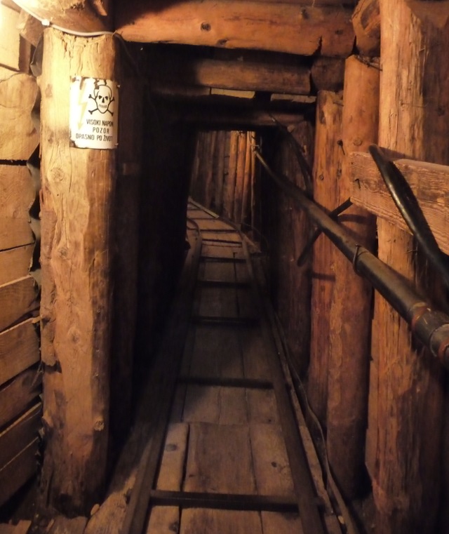 The high-voltage cable that was strung along the ceiling next to an oil pipe, between them providing the only energy supplies, are both still physically present but the danger they would have presented to those using the tunnel was not. The corrugated steel sheeting protecting the entrance to the tunnel is perforated with ragged bullet holes, and the tail of a shell sticks out of a hole in the concrete next to it. And this was the safe end…
