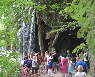 The weather forecast was iffy with a chance of rain, and it was overcast as we headed for the bus next morning, which was soon crammed with people. We knew it would be busy – it was a Saturday in July after all. We were dropped above the lakes at entrance one of the park. In short, Plitvice is an eight kilometre long series of lakes with waterfalls between them of varying degrees of spectacularness, with cliffs and forest around the edges. Trickles and streams and falls seeping through forests and reeds everywhere you walked. These features were formed by the movement of travertine, deposited by the movement of the water as it makes its way downstream.