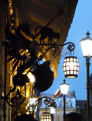 Still, for Ellie’s birthday evening, we met up in town with a smashing couple we’d bumped into at the campsite – David & Tracey, on a long trip in a VW T4 van – and hit some bars. There wasn’t a lot to say for the first one – right in full-on tourist central – apart from the waitress’s very, very tight t-shirt. We moved on, though, via another couple of bars – including the Irish-themed “Gin Factory”, and found some food in the Caru’ cu Bere – Beer Cart – restaurant. It’s a bit of an institution, and the building hasn’t changed much for centuries, inside or out.