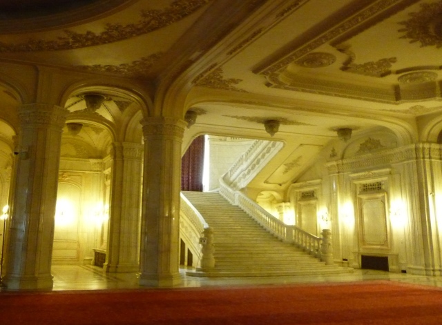 Apart from the actual parliamentary chambers – we were shown the firmly closed doors, and told they were never open to the public – we wandered from hall to hall, wowed at every turn by the sheer opulence. And, yet, there was a certain incongruity about it all – you walked into a fabulously luxuriant chamber, every detail gorgeous – except the tables are all covered in discarded glossy brochures and cables for microphones leading back to the flimsy row of cubicles housing the simultaneous translators. Some of the hand-made carpets are starting to look threadbare, especially around the should-never-have-been-there seams. Walls are already cracking and peeling badly in places – not least around the joins between the three buildings. Three? Yes, three. The palace isn’t just one structure, but three completely separate structures with a gap of an inch or two between them – Bucharest is very earthquake-prone, and this is one way that the architects tried to provide seismic protection.