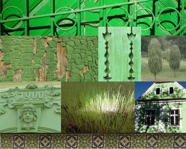We are loving the vernacular architecture of the rural hinterlands, where horses pulling long carts are commonplace, as are people in traditional dress. This green collage is mostly inspired by those details, from walls, verandas, doorways and gates in both town and country in the Transylvania and Moldavia regions. I love textures and the old paint on a rare neglected door creates a texture like a reptile’s skin. We have been spotting different styles and methods of haystacking on our travels too, and the picture on the right hand side shows some fresh ‘haystack trees’ – so much prettier than hay bales in plastic bags don’t you think?