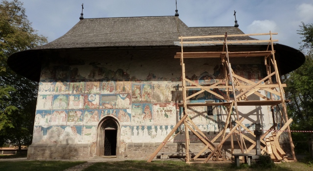The nearby Pătrăuti church was, like its near namesake, sadly closed but we could see the remains of the painted exterior.