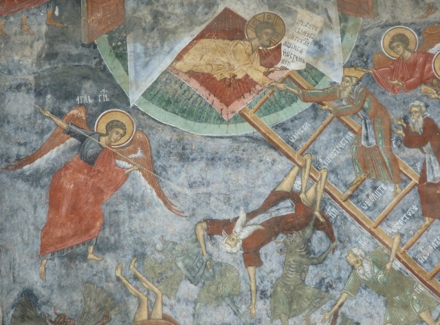 Later, it was thought to be the fifteenth century Metropolitan of Moldavia, Grigore Roșca, who had the idea of painting the exterior walls of the monastery churches with biblical scenes for the peasants, an illustrated book open to all to understand. The frescoes are a much thinner layer than those found in Italy, so it is remarkable that any have survived the buffetting of the elements over centuries. The subjects recur and scenes are often depicted in a similar way, the Day of Judgement takes pride of place on many walls, but the tree of Jesse (the biblical family tree) is also seen a lot, then there are the rows of saints and events of the Old and New Testaments. The imagery shows a Byzantine influence, but little is known of the artists. The colours they used are extraordinary and vary from place to place with the blue used at Voroneț being the most famous.