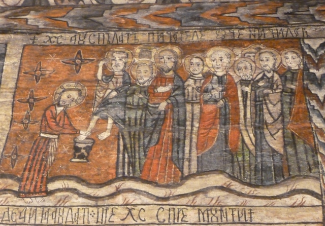 On the way there from Viseu de Sus we passed cross-country into the Iza valley, one of the prettiest areas and visited the church at Ieud. Luckily signs pointed the way, and  there was a small group of young restorers working on cleaning icons so it was open. Like the stone-built churches, there is a pro-naos or anteroom before entering the naos – the main area for worship. Beyond this, usually hidden from public view behind the iconostasis screen, is the half-circle altar area. The interior walls and ceilings are painted, and there is a gallery above reached by a ladder, often a whole tree trunk, with steps cut into it. The imagery is of course biblical – again the day of judgement features strongly – and often quite primitive in style. At Ieud many of the precious pictures had faded or flaked away.