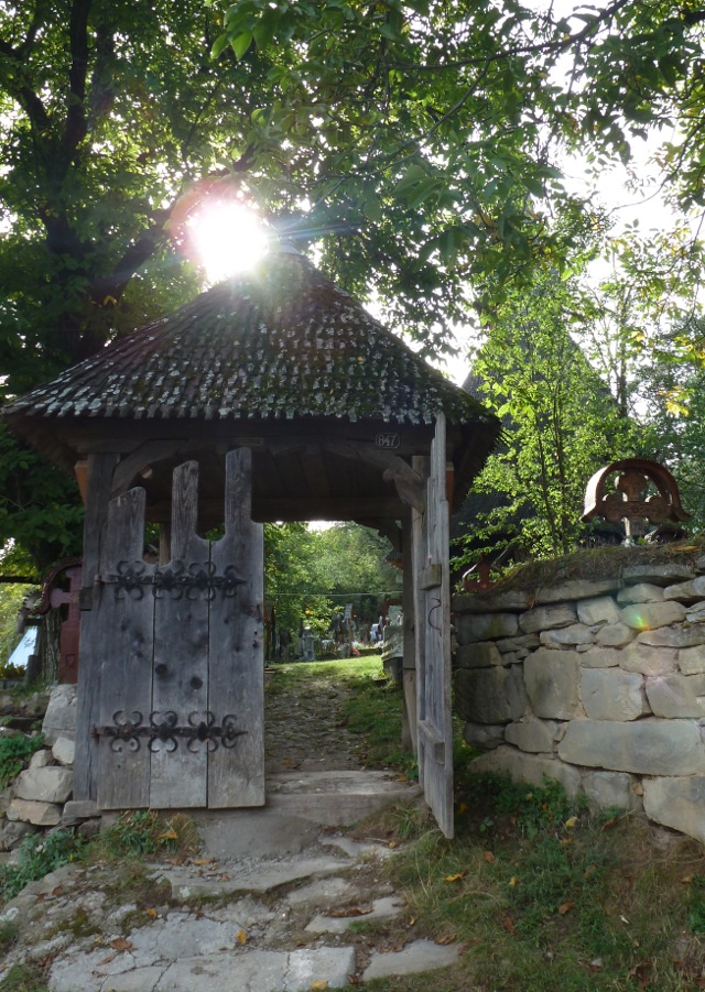 One last quick visit to the tiny (and closed) wooden church at Sat-Șugatag, along the road, where it was hard to keep the goats from following us through the wooden gates into the cemetery – the chickens were there already after all. The weather had turned dull again, the scent of windfall apples drifted on the damp breeze and we were just about churched out for one day.