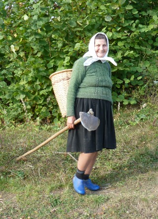 Maramureş is a very traditional area of gentle undulating green hills, dotted with haystacks and with a hardworking largely peasant population – very much people of the land. Horse carts proliferate, and many roads are still unmade up and rough in places. Many villagers apparently still believe in vampires, werewolves and other creatures of the night, and there are still plenty of wooden houses with carved wooden gates, although in some places they are gradually being replaced with new rendered brick houses. Take photographs in black and white and you could be back 70 years, and things probably haven’t changed so much in a couple of hundred years (ignoring the odd satellite dish). You still see people in traditional dress, especially on Sundays – men in straw hats, elegant younger women in flowery flouncy skirts sitting just above the knee with matching scarves, the barrel-shaped old ladies in their uniform of black skirts and headscarves, white blouses and green cardigans.