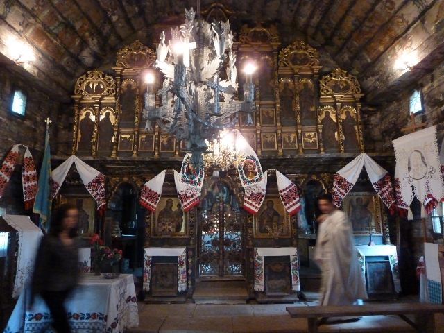 On the Sunday, we went first to Breb’s wooden church, passing many traditionally dressed parishioners on the way, picking their way along the muddy lanes in their finery. Having been back and forth in Breb several times by now, the villagers’ reserve was beginning to falter and we got big smiles and waves from folk of all ages. The church is tiny, and a sort of open come and go as you please service was progressing, we entered discreetly to see the homely interior with rugs everywhere and highly embroidered clothes draped over the top of the icons.