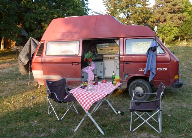 The campsite was open, but deserted. We were the only people there in fact, but it was lush and green and we parked amongst the trees. In the early hours we awoke to one of the most dramatic thunderstorms we’ve experienced, wildly flashing lightening and rolling of thunder fit to wake the dead and shake the van where it stood. Torrential rain followed, the remains of which lasted all the following day.